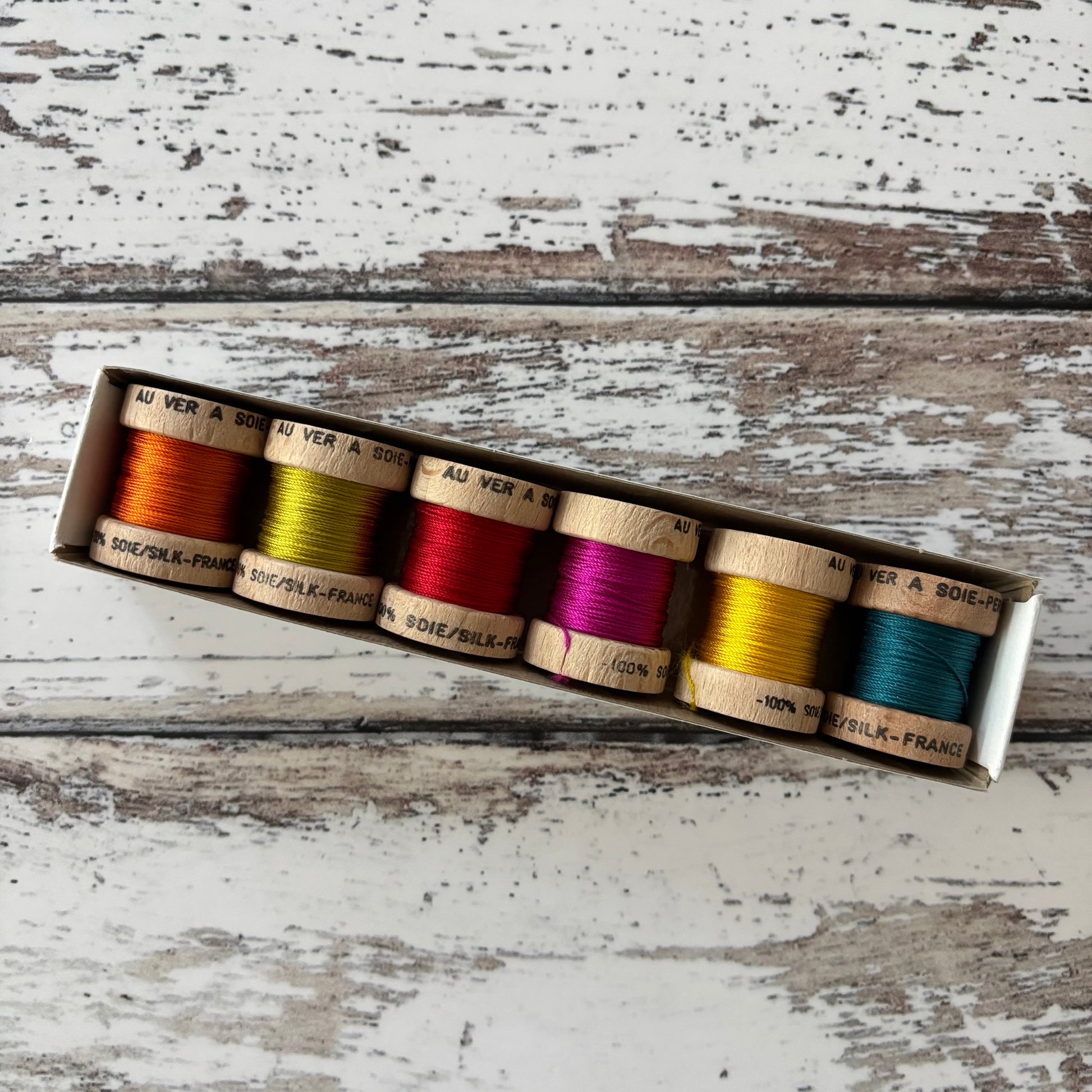 Six wooden spools of size 16 3ply twisted silk thread that is smooth, soft and lustrous. The thread does not snarl in the needle, has a good tensile strength and resists well to abrasion, 16 meters per spool.