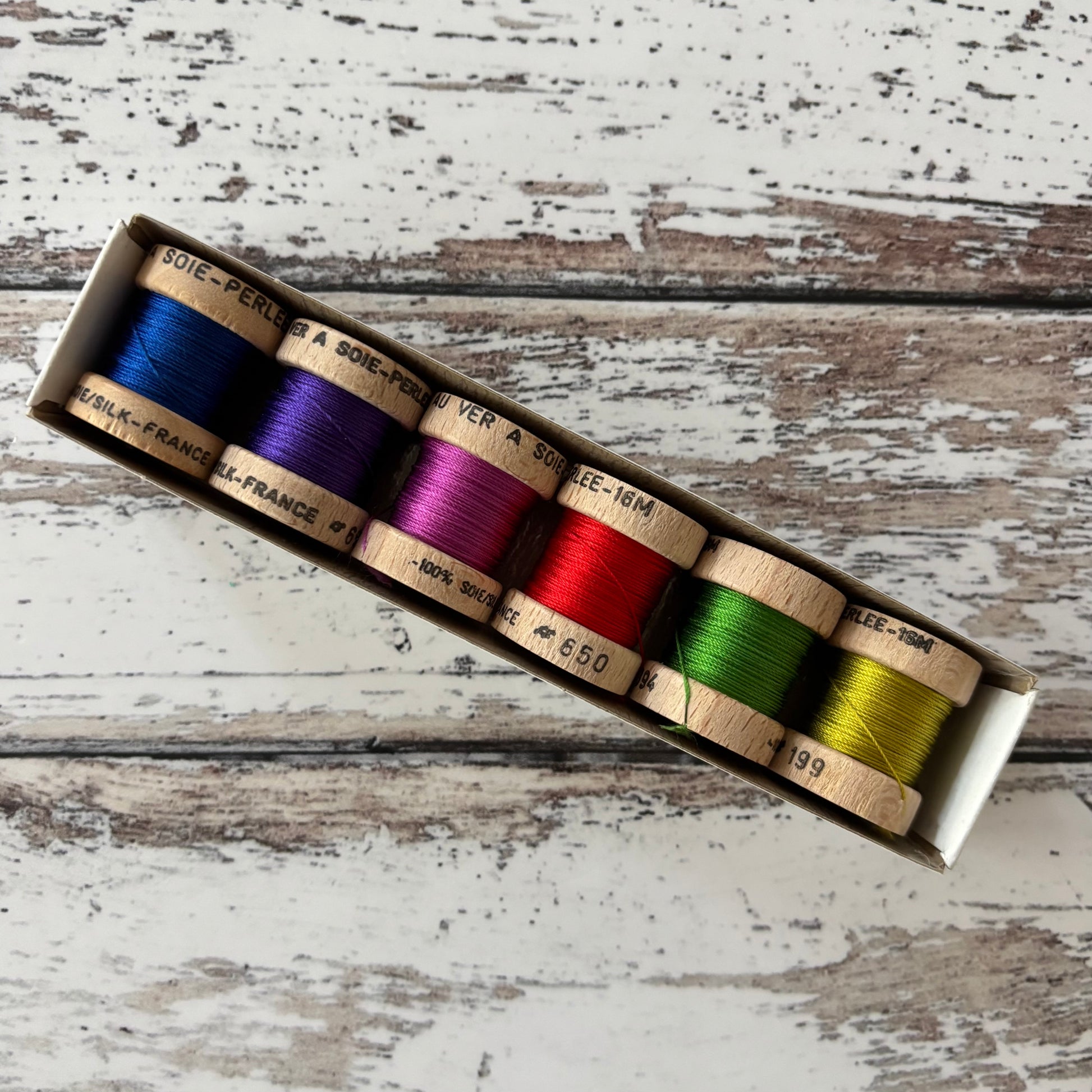 Six wooden spools of size 16 3ply twisted silk thread that is smooth, soft and lustrous. The thread does not snarl in the needle, has a good tensile strength and resists well to abrasion, 16 meters per spool.