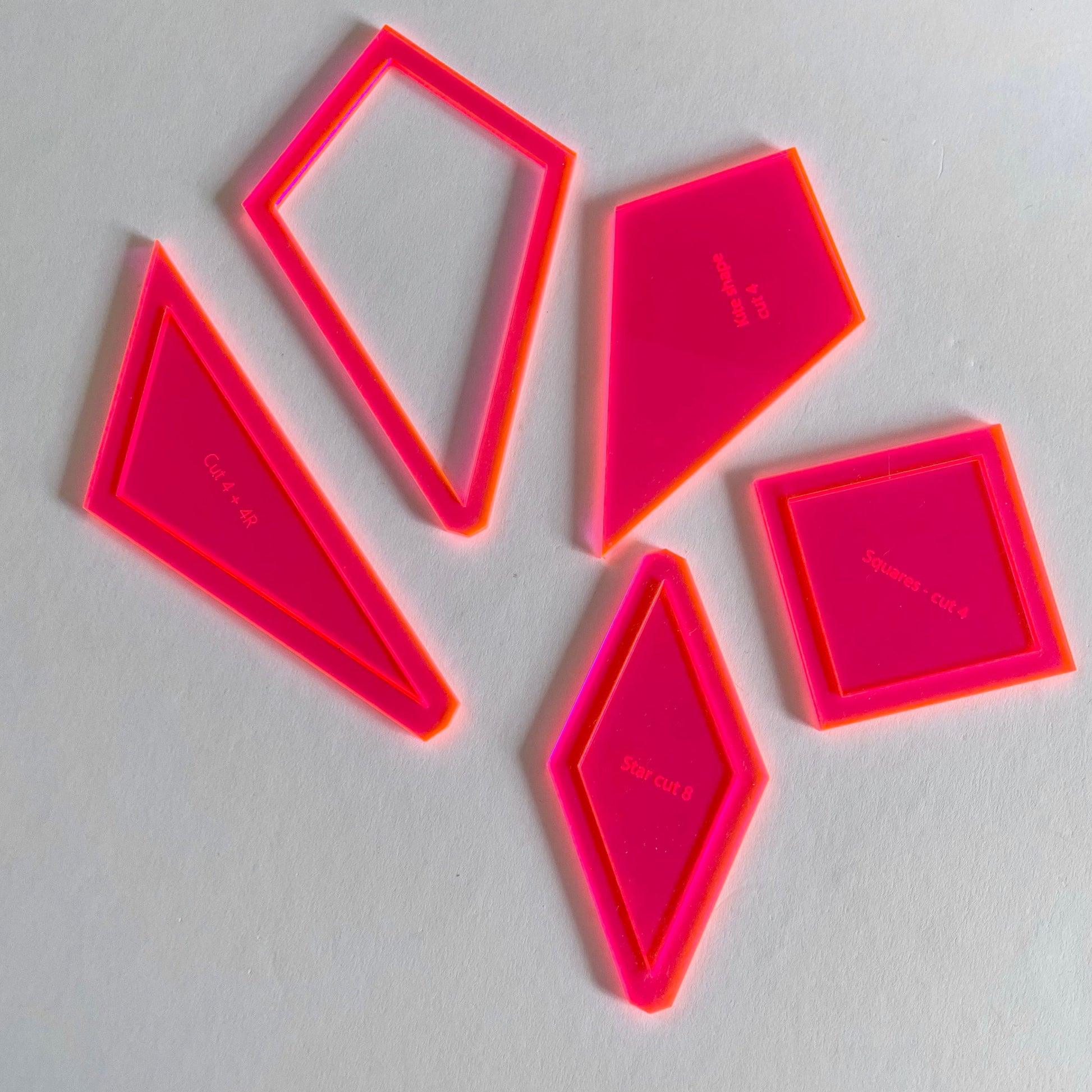 The acrylic templates are made from neon pink acrylic and feature a removable seam allowance making them perfect for those who wish to hand piece this quilt.
