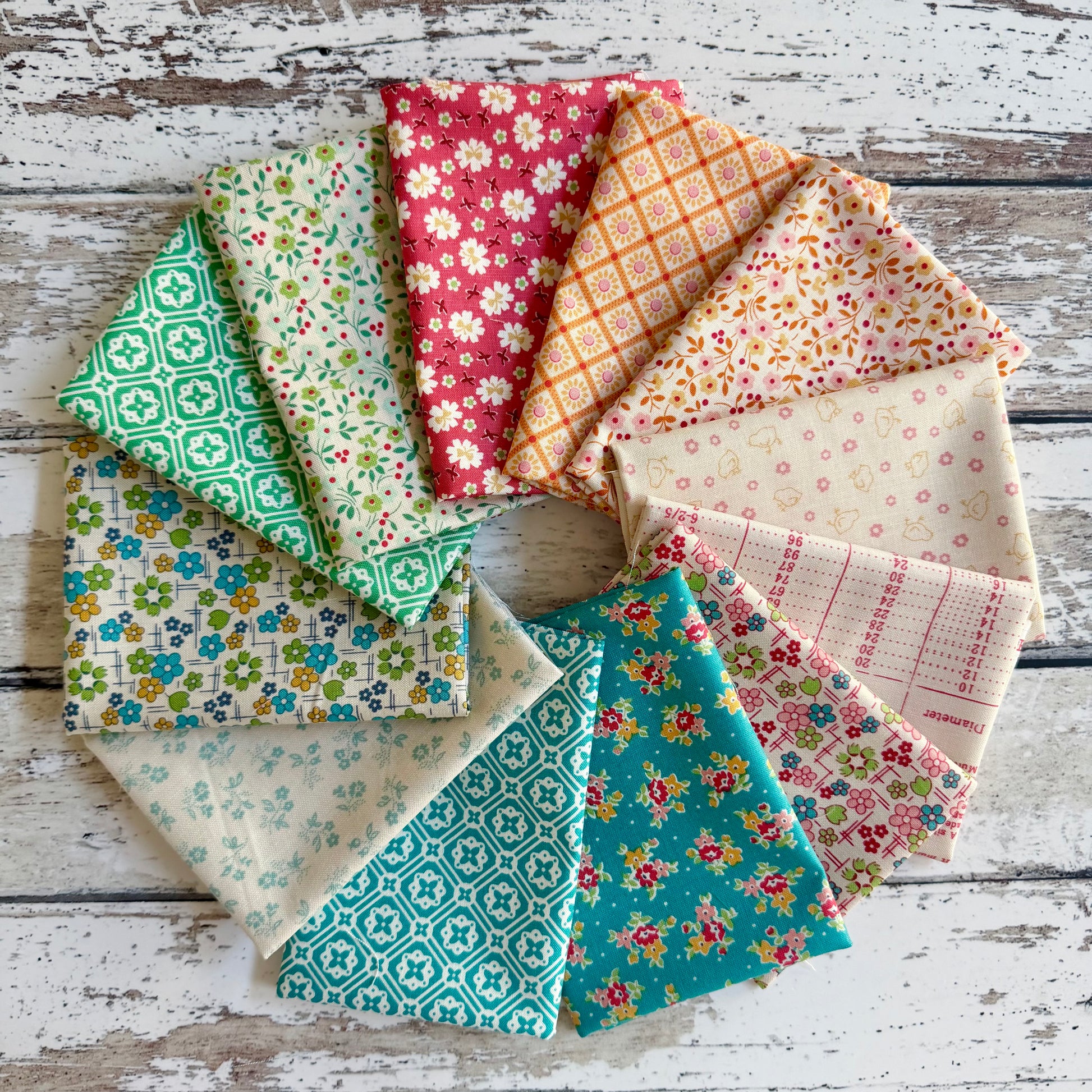 Twelve fat eighths of beautiful 30’s inspired prints from Lori Holt for Riley Blake. A gorgeous mix of low and high volume prints with geometrics, whimsy and fabulous florals.