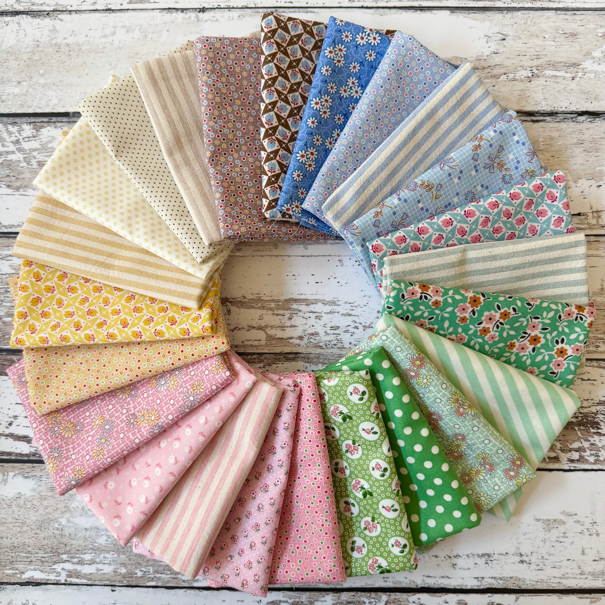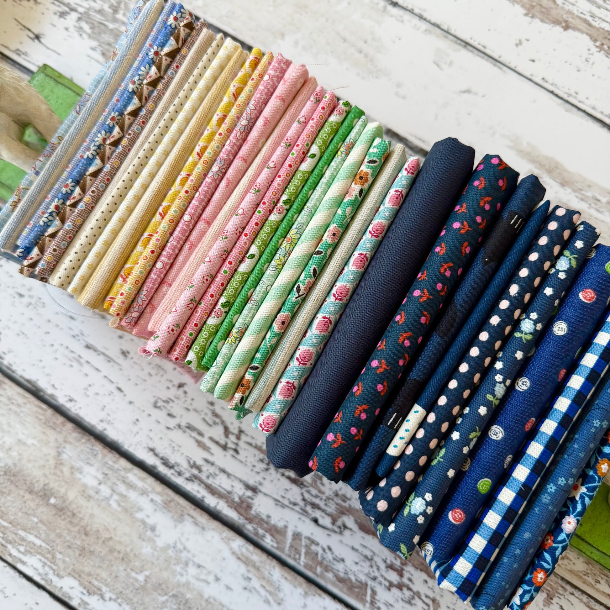 Inspired by the quilt Bec is making (and sharing on YouTube) this bundle includes a beautiful mix of low volume pastels and high volume navy blues.