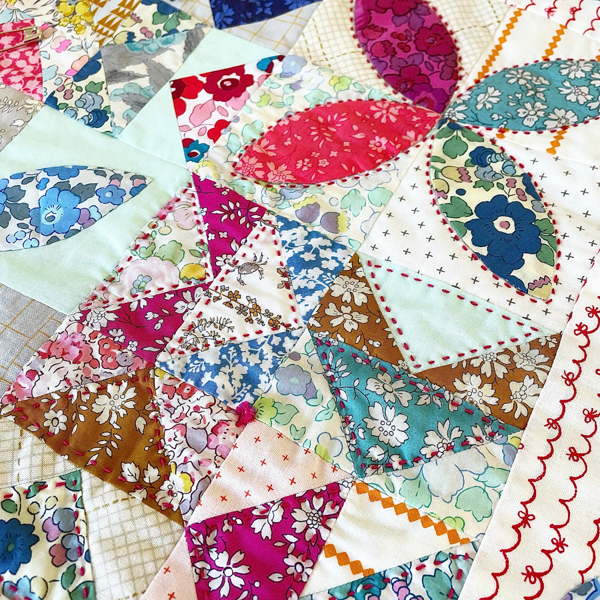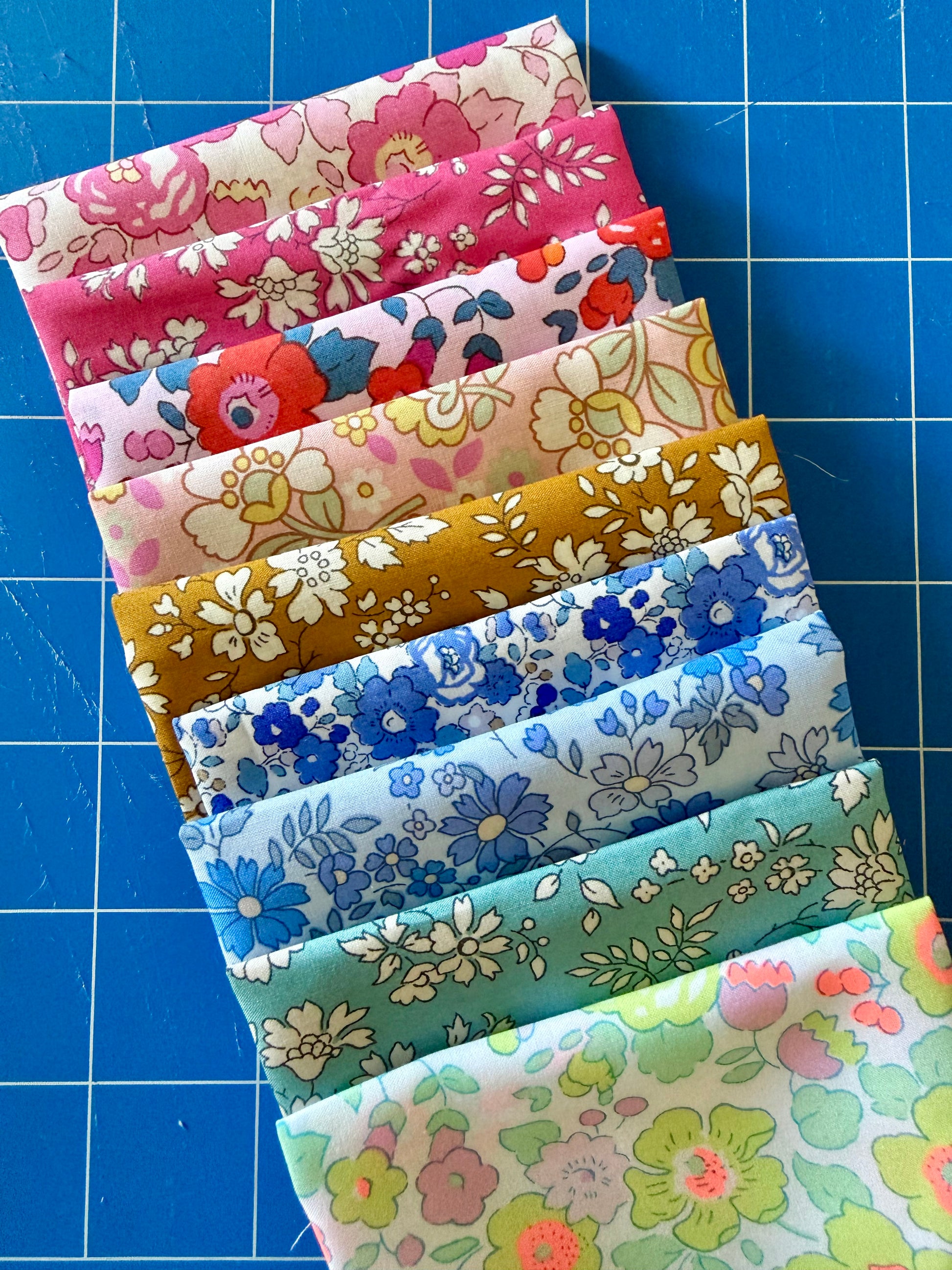 The bundle includes 9 Liberty tana lawns and 8 quilting cottons including a fat quarter of the low volume with red stitches.