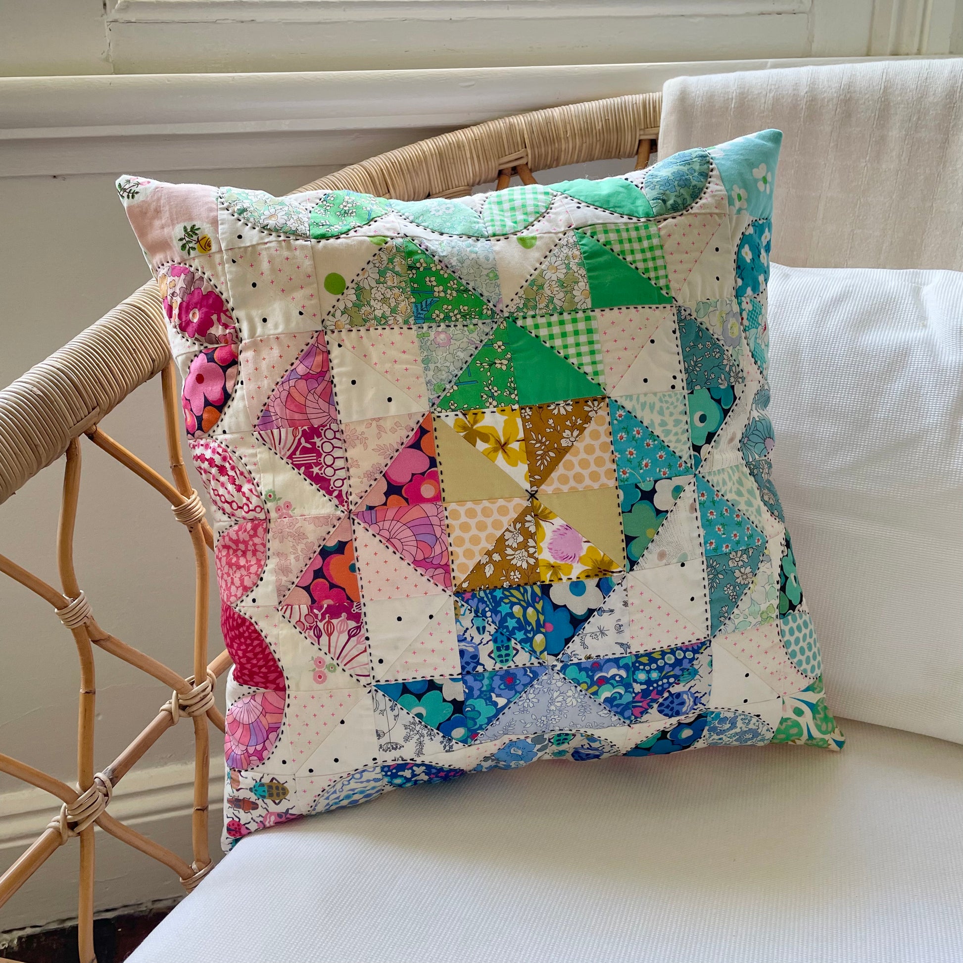 The PDF pattern includes colour diagrams and detailed instructions to machine piece your cushion covers and for needle turn embellishment.