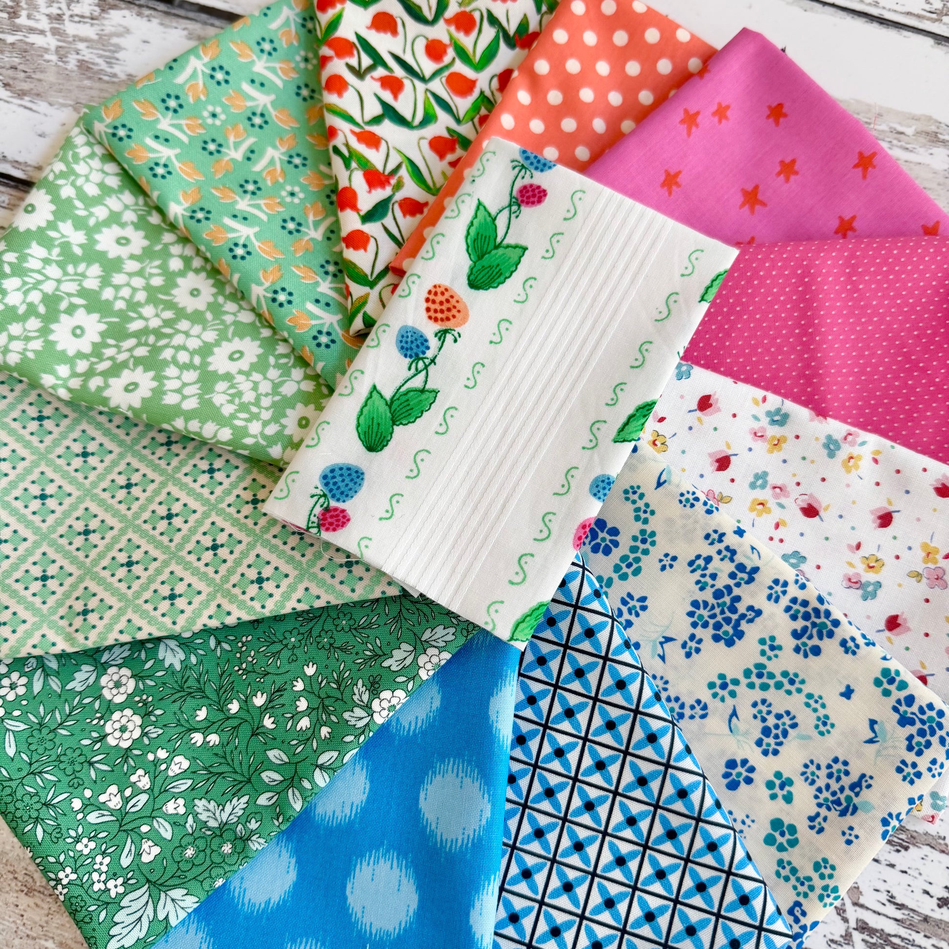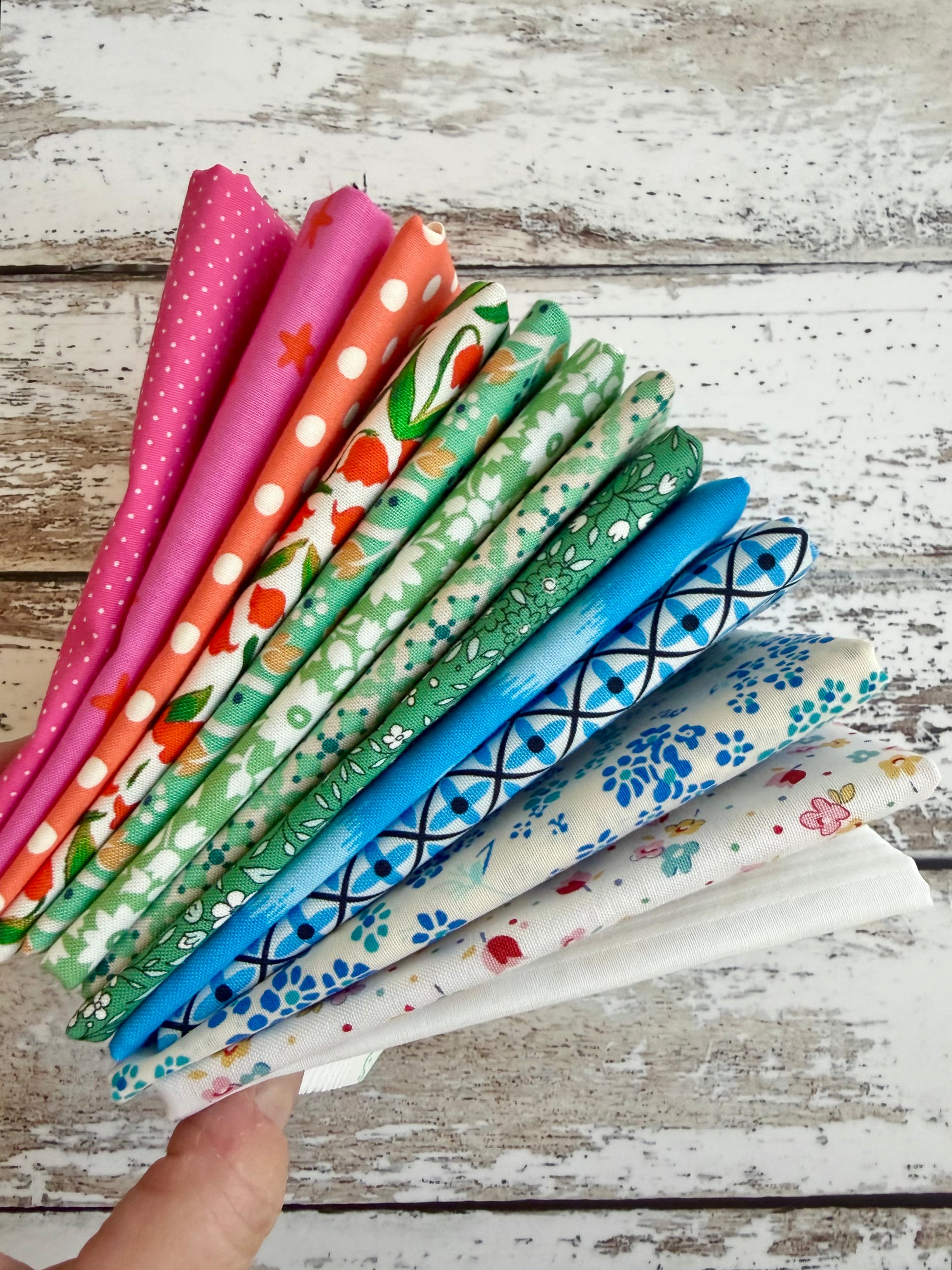 This beautiful bundle includes 12 fat eighths of lovely prints across a range of colours coordinated with one vintage fabric. A fun eclectic mix for a scrappy quilter.
