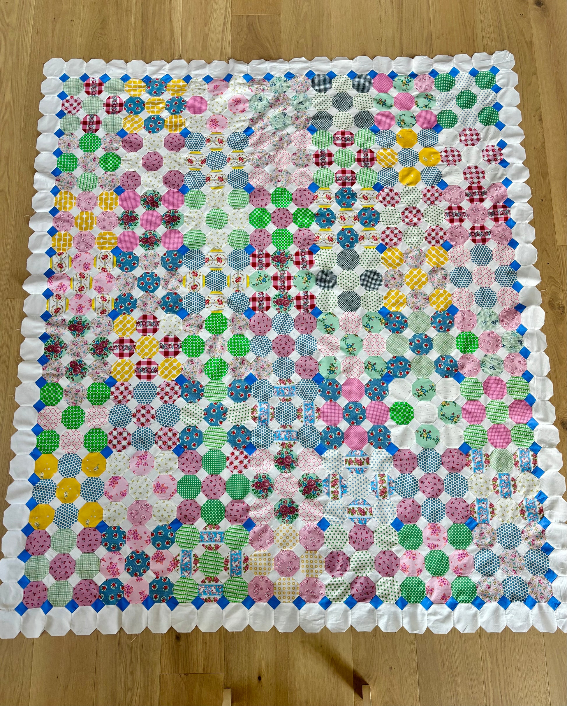 Sadie’s Quilt is a variation of a traditional quilt design - Ozark Cobblestones – and inspired by a beautiful found vintage quilt. The quilt is made by hand piecing and features a scalloped border (a simpler border is also included in the instructions as an alternative).