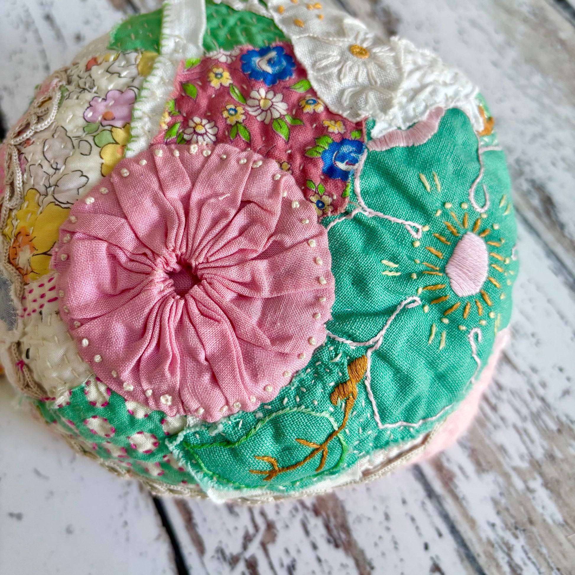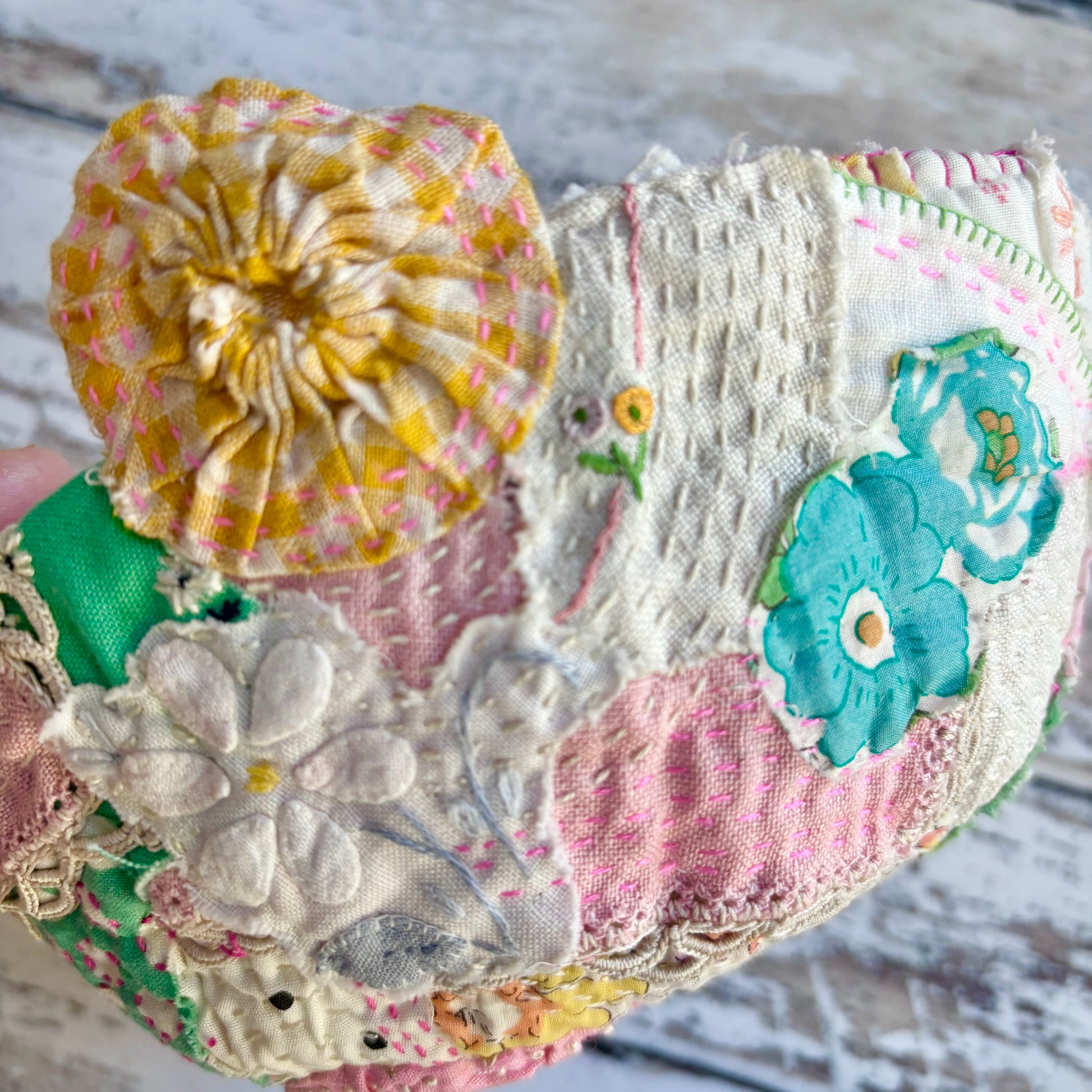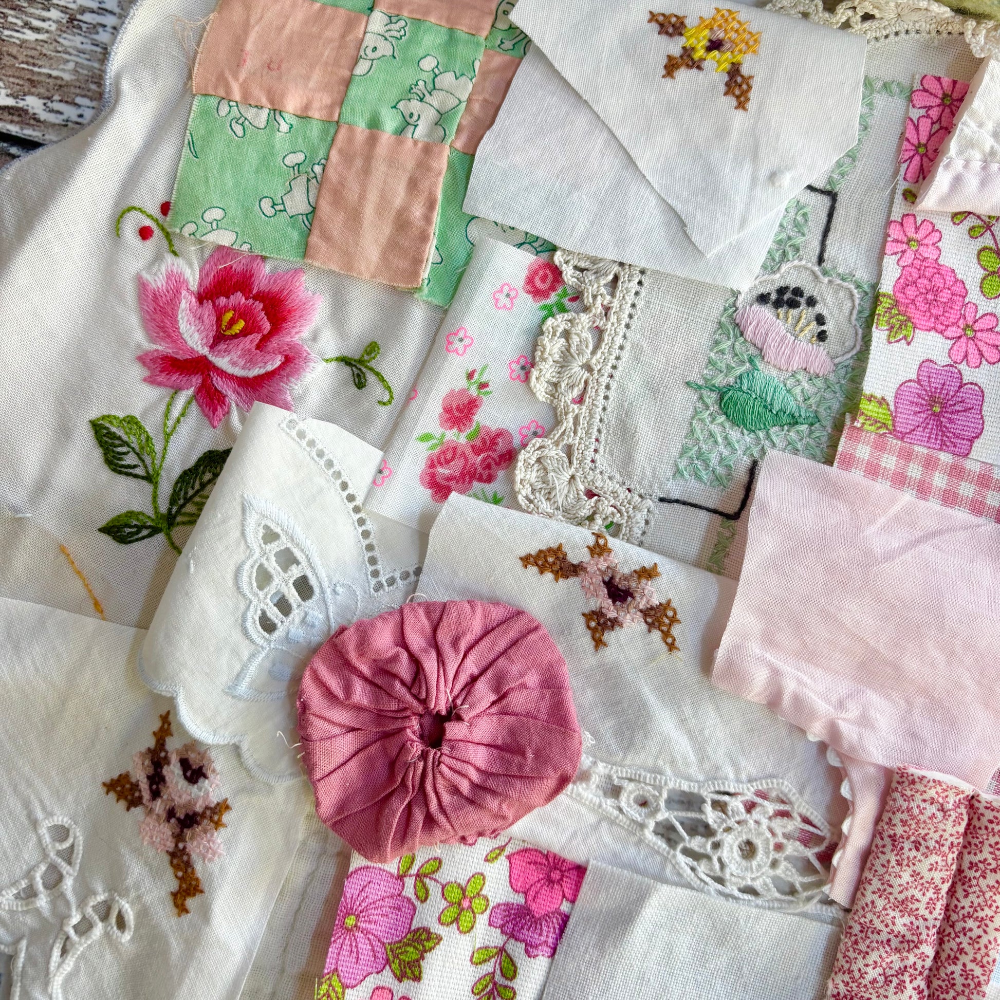 - a selection of curated vintage textiles. Each pack is unique, but expect yours to include pieces of vintage and a few new fabrics, yo-yos, small snipers of vintage quilts, embroidered, embellished and cross stitched snipers and vintage trims, similar to those shown in the photos. In addition each kit includes a lovely vintage nine patch that has been hand pieced by a previous maker.