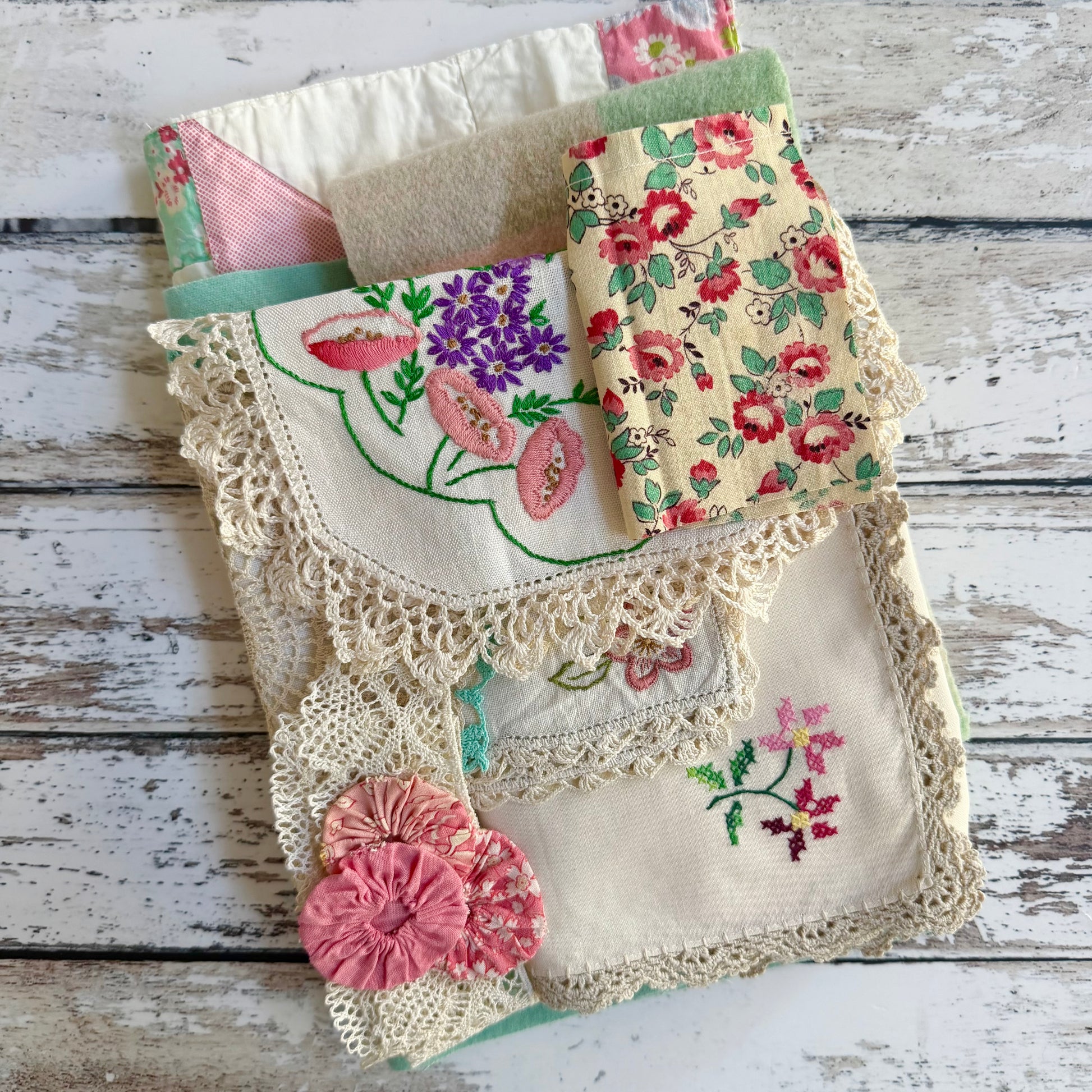 This bundle has been curated around a lovely piece of vintage quilt. Additional textiles have been chosen with care to form the base of a one of a kind vintage textile needlebook.