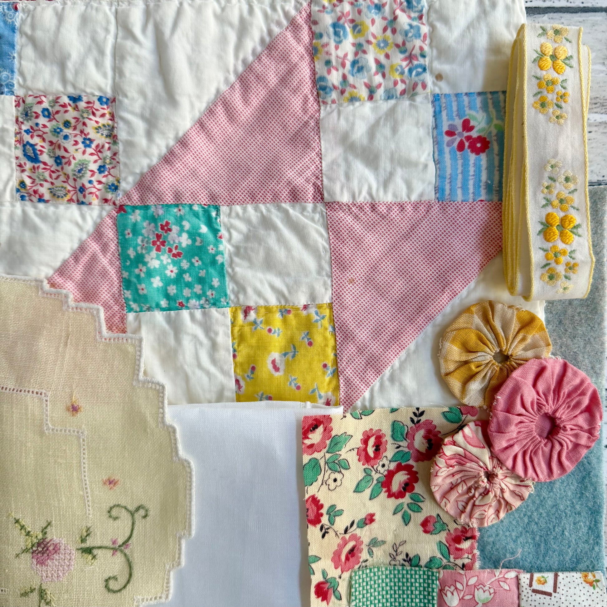 This bundle has been curated around a lovely piece of vintage quilt. Additional textiles have been chosen with care to form the base of a one of a kind vintage textile needlebook.